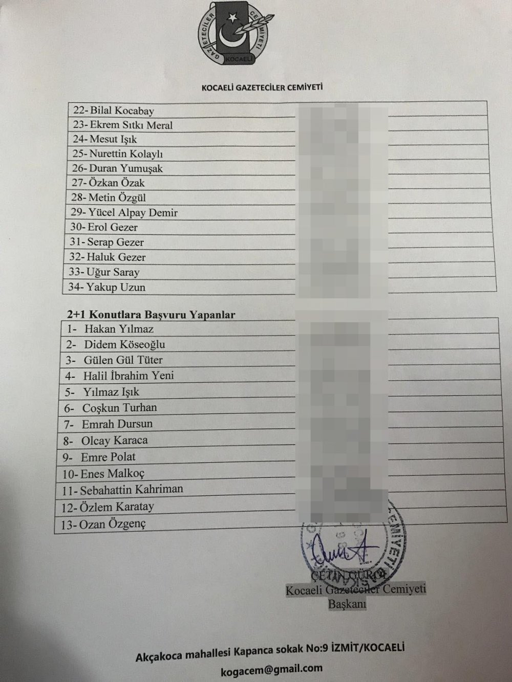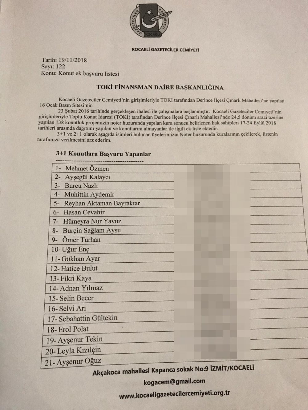 Kocaeli Gazeteciler Cemiyeti’nin girişimleriyle TOKİ tarafından Derince Çınarlı Mahallesi’ne yapılan 138 konutluk 16 Ocak Basın Sitesi’nden noter huzurunda yapılan çekilişin ardından hak sahibi olanların almadığı 2+1 ve 3+1 daireler için ilk başvuruda bulunan üyelerimiz ek belgededir.