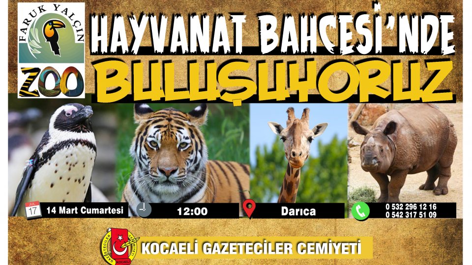 Hayvanat Bahçesi'nde Buluşuyoruz Kocaeli Gazeteciler Cemiyeti 04 Mart 2020 0 Darıca Hayvanat Bahçesi'nde yer alan sevimli hayvanları ailelerimizle gezerek göreceğiz.