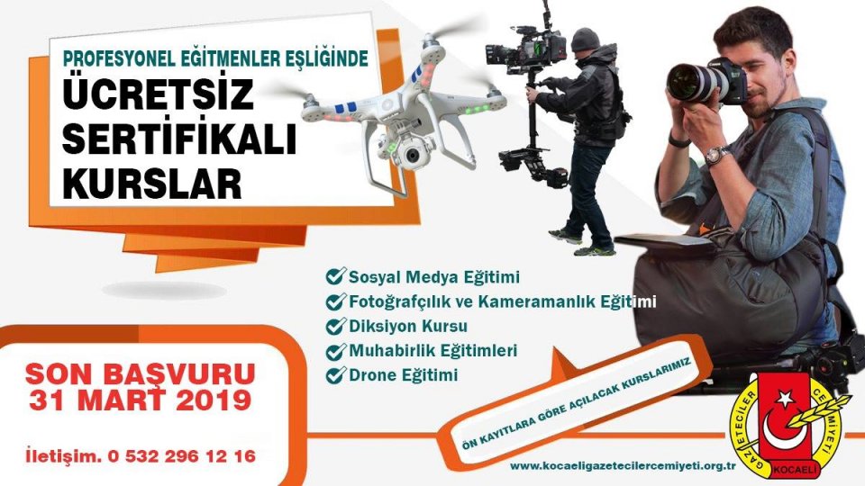 Drone Eğitimi-Sosyal Medya Eğitimi-Fotoğrafçılık ve Kameramanlık Eğitimi- Diksiyon Kursu- Muhabirlik Eğitimleri konusunda Kocaeli Gazeteciler Cemiyeti olarak üyelerimizden gelecek ön kayıtlardaki talepler doğrultusunda kurslar açacaktır. Kurslara katılmak isteyen üyelerimizin Cemiyet yönetimimize 31 Mart tarihine kadar bildirmeleri gerekmektedir.