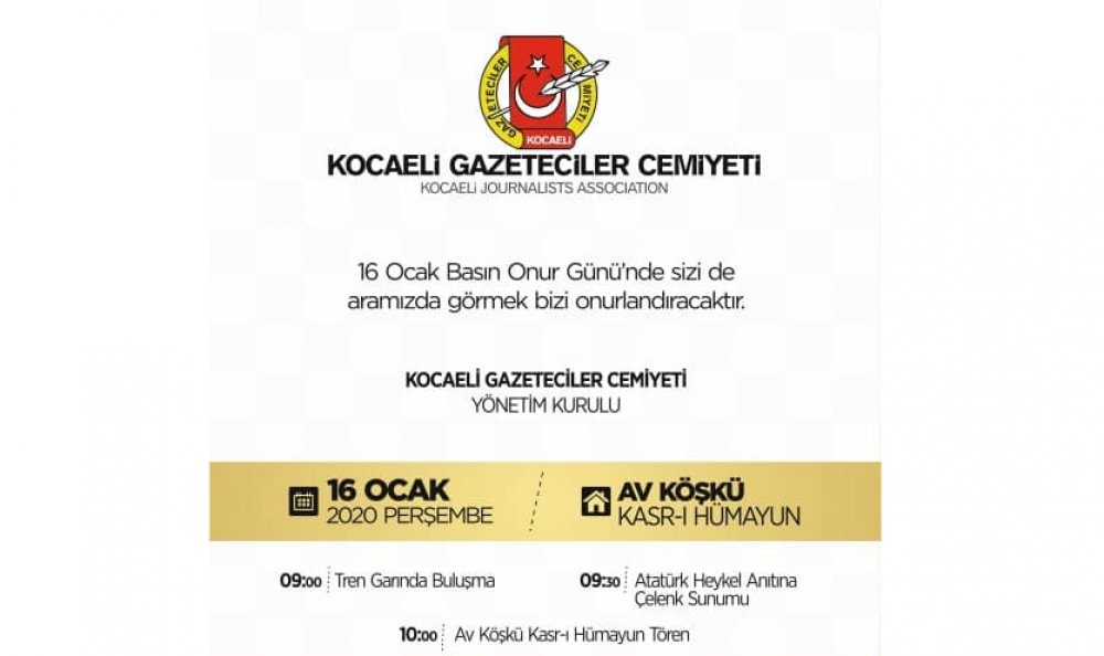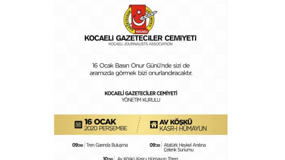 Kocaeli Gazeteciler Cemiyeti üyelerimizle birlikte 16 Ocak Basın Onur Günün'de ilk olarak Tren Garında buluşuyoruz. Ardından Atatürk Anıtına çelenk koyuyoruz. Hemen ardından Atatürk'ün Basın toplantısını yaptığı Kasr-ı Hümayün'deki törene katılıyoruz. Akşam ise baloda buluşuyoruz.
